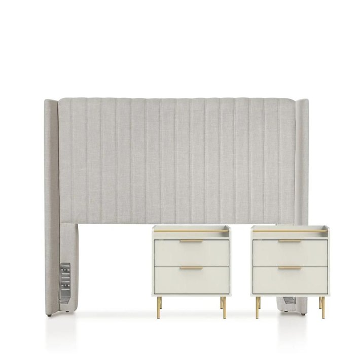Conjunto 2 Mesas de Cabeceira Yves e Cabeceira Queen Reid - Off White C/ Dourado - Linho Mescla