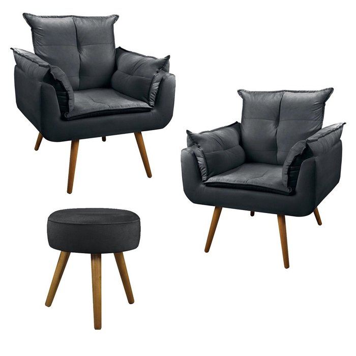 Conjunto 2 Poltronas Decorativas Opala e 1 Puff Redondo Pés Palito Suede Cinza Lual Decor