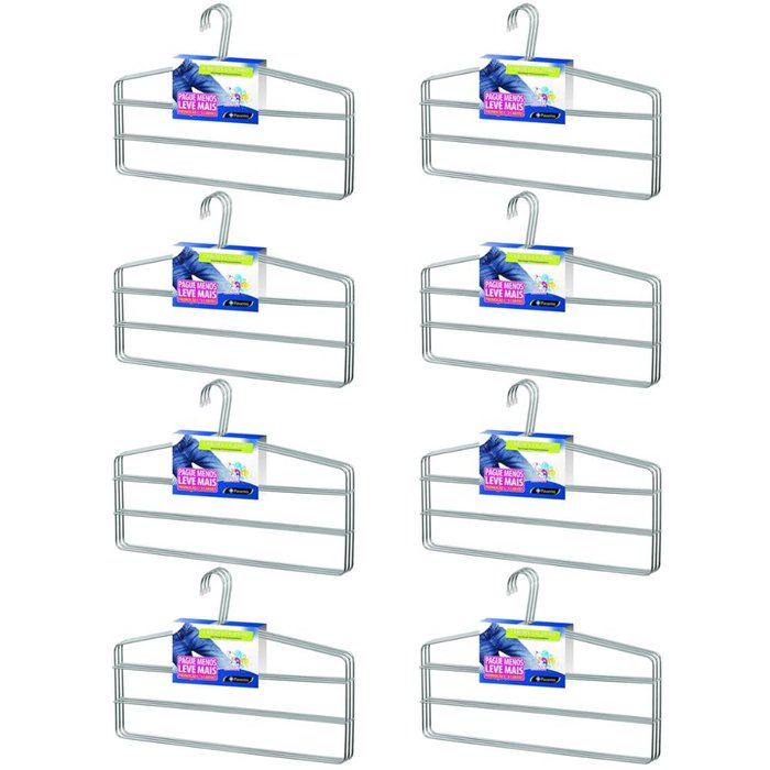 Conjunto 24 Cabides para Calças Triplos Passerini Calceiros em Aço Cromado<br><br>Garantia: 90 dias / Peso: 3kg / Cor predominante: cromado / Referência: 7897089802747X8<br>Dimensões de cada cabide: 38cm (C) x 0,3cm (L) x 28cm (A);<br>Quantidade de cabides: 24 unidades;<br>Material: aço cromado.<br><br>Limpeza e cuidados:<br>- Limpar com pano levemente umedecido seguido de pano seco;<br>- Não utilizar produtos químicos ou abrasivos na limpeza;<br>- Evitar batidas e contato com objetos cortantes.<br><br>Com estética minimalista e elegante para padronizar o seu armário, este conjunto de 24 cabides calceiros com 3 seções da Passerini garante praticidade no acesso e organização das peças. Ideal para otimizar o espaço, estes cabides cromado para roupas possuem 3 barras que são ótimas opções para uso com calças jeans ou de sarja.