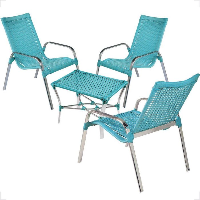 Conjunto 3 Cadeiras E Mesa De Centro Alumínio Para área Externa Fortaleza Fibra Sintética Artesanal Cor:turquesa