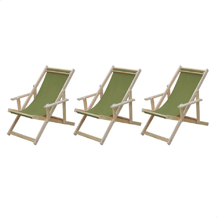 Conjunto 3 Espreguiçadeiras Preguiçosa Dobrável Madeira Maciça Natural com Tecido Verde Natural