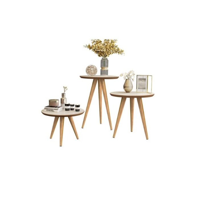 Conjunto 3 mesas classic apoio lateral centro redonda bordas invertidas Decorativa Off White Freijo