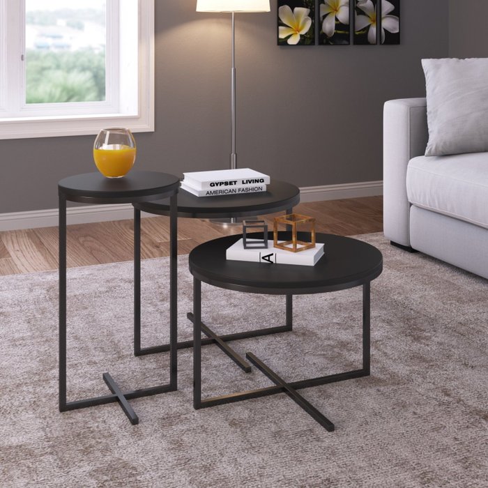 Conjunto 3 Mesas Redondas Industrial Preto/Preto
