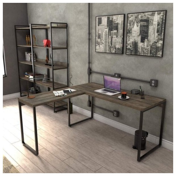 Conjunto 3 Peças com Mesa para Escritório em L Kuadra e 2 Estantes Multiuso 5 Prateleiras Industrial preta Carvalho Dark/Preto