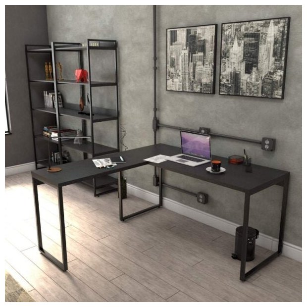 Conjunto 3 Peças com Mesa para Escritório em L Kuadra e 2 Estantes Multiuso 5 Prateleiras Industrial Ônix Preto