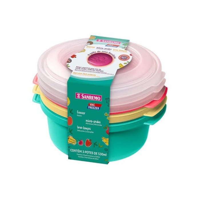 Conjunto 3 Pote Plástico Colorido 530ml Vac Freezer Tampa Reversível Sanremo