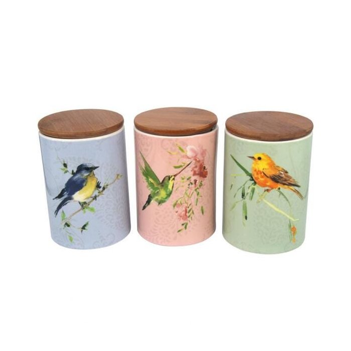 O conjunto 3 potes ceramica tampa madeira 1,3l 11,5x17cm BTC leva o romântismo da cerâmica decorada para a sua cozinha. São três potes rosa, azul claro e verde água decorados com gravuras de pássaros na natureza. Feitos em cerâmica com tampa em madeira. Este conjunto de potes darão um show na sua cozinha.