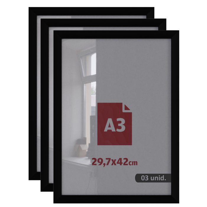 Conjunto 3 Quadros A3 Moldura Lisa C/ Vidro Premium:Preto