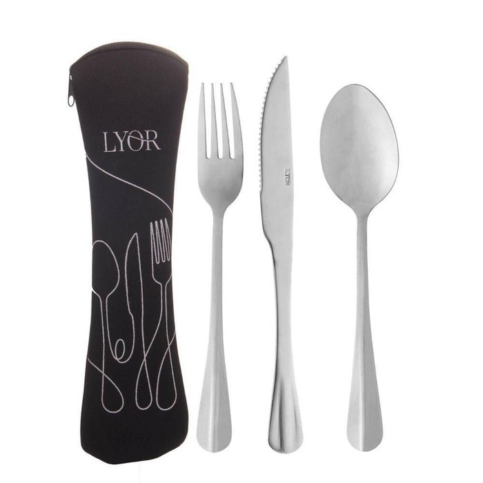 Conjunto 3 Talheres Viagem Marmita com Estojo Portátil Garfo Faca e Colher em Aço Inox Lyor Preto