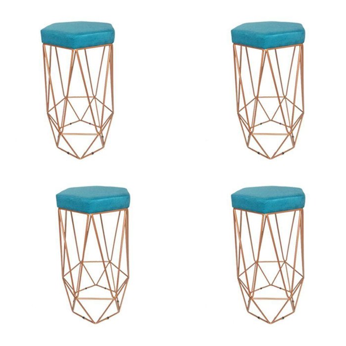 Conjunto 4 Banquetas Decorativa Hexagonal Aramado Bronze Suede Azul Tifany Rocha Móveis