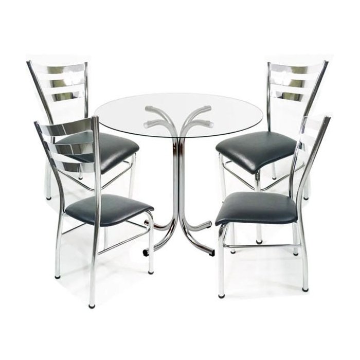 Quer deixar sua sala de jantar ou cozinha mais prática e com móveis de altíssima qualidade? Então não perca este lindo Conjunto, composto por 4 cadeiras cromadas com reforço tubo 1", encosto em chapa, com assento em material sintético na cor preta + base de mesa cromada + tampo incolor redondo de 6mm de espessura. As cadeiras do Conjunto já vão montadas para maior facilidade, porém necessita montagem simples da base de mesa.