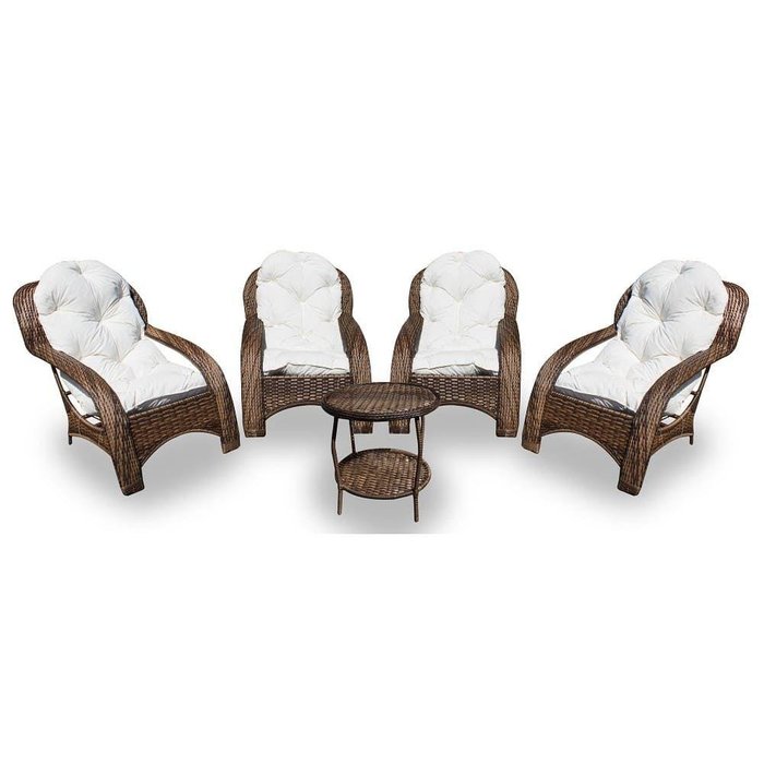 Conjunto composto por: 04 Poltronas ESpreguiçadeira em Fibra Sintética e 01 Mesa de Centro Redonda.
