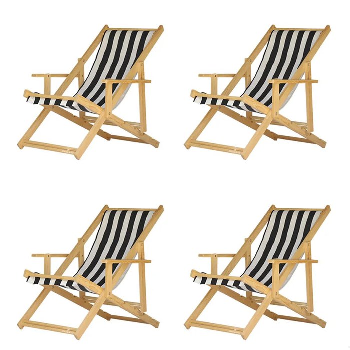 Conjunto 4 Espreguiçadeiras Preguiçosa Dobrável Madeira Maciça Natural com Tecido - Listrado Preto Natural