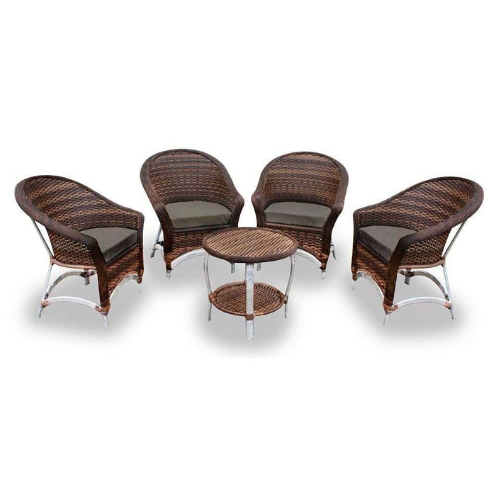 A estrutura de alumínio envolto em fibra sintética garante a qualidade de nossos produtos. Nossas almofadas são revestidas com tecidos Acquablock, compostos por 72% algodão e 28% poliéster, com acabamento impermeável. Confira os tecidos disponíveis e todas as vantagens Acquablock aqui. Conjunto composto por:4 PoltronasDimensões A85 x L66 x C70 cm1 Mesa de centro redondaDimensões A52 x D54 cm Por se tratar de confecção artesanal, as dimensões dos produtos podem sofrer variação. Cuidados na manutenção do seu móvel Material de fibra sintética é ideal para utilização em ambientes externos, necessitando apenas de pequenos cuidados para que seu móvel mantenha sua aparência como novo. O ideal é limpar as peças semanalmente, usando uma escova com cerdas macias molhada em uma mistura de água com sabão neutro ou pano úmido. Na sequência, deixe os móveis secarem naturalmente à sombra. Durante a higienização de sintéticos, respeite também o sentido das fibras e nunca aplique força demasiada para não comprometer a superfície do trançado.Nunca utilizar lavadoras de pressão sobre as fibras. As almofadas de assento e encosto são em tecido impermeável, que bloqueia líquidos, poeiras e fungos, não sendo aconselhável a permanência de estofados em ambiente externo, expostos a intempéries climáticas (chuva). Garantia Este móvel tem garantia de quatro (04) meses, se usado em condições normais, contra defeitos de fabricação. Essa garantia não cobre defeitos causados por uso inadequado ou abusivo, falta de cuidados, desbotamento natural dos tecidos ou riscos decorrentes do uso.