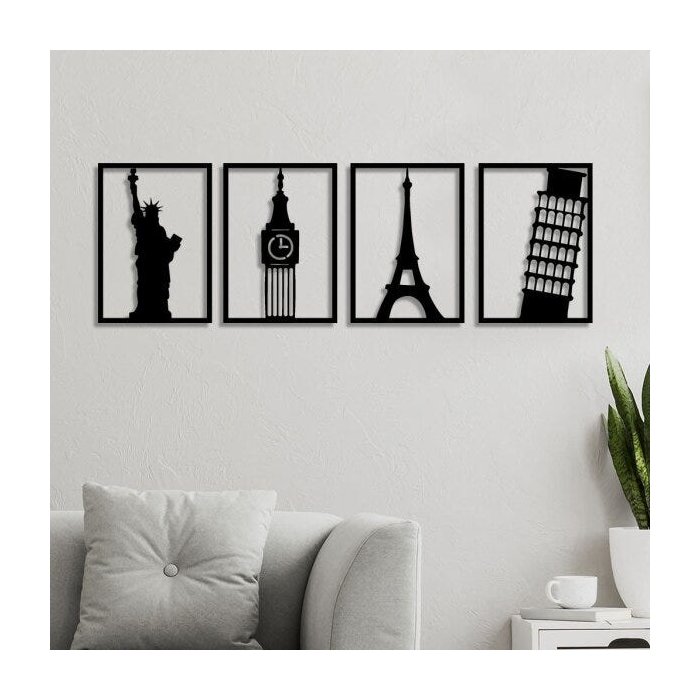 Conjunto 4 Quadros Vazados em MDF Maravilhas do Mundo Preto