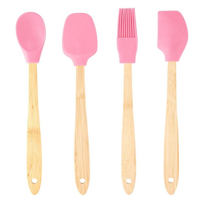 Conjunto 4 Utensílios De Silicone Com Cabo Em Bambu Rosa