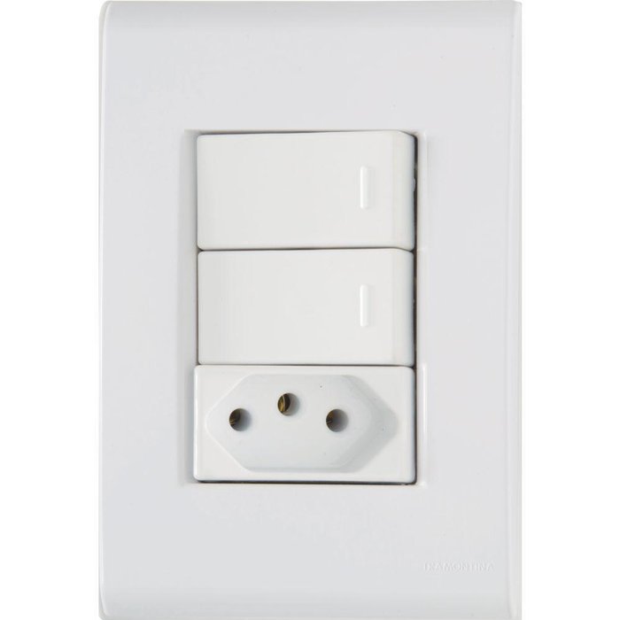 Com o Conjunto 4x2 com 2 Interruptores Simples 10 A 250 V e 1 Tomada 2P T 20 A 250 V Tramontina Liz Branco você ilumina seus ambientes e liga equipamentos de maneira funcional e prática. Produzido em termoplástico branco, ele vai garantir maior praticidade e proporcionar um acabamento perfeito entre a placa e a parede, sem deixar frestas e vincos na instalação. Além disso, possui furo oblongo que facilita a fixação e a regulagem da placa à parede e evita que ela fique desalinhada. Sua fixação não é aparente e pode ser utilizada tanto em paredes de alvenaria, quanto em paredes de madeira. A placa ainda pode ser trocada por outras cores da linha, garantindo maior versatilidade. Deixe sua casa equipada e completa com a Tramontina!