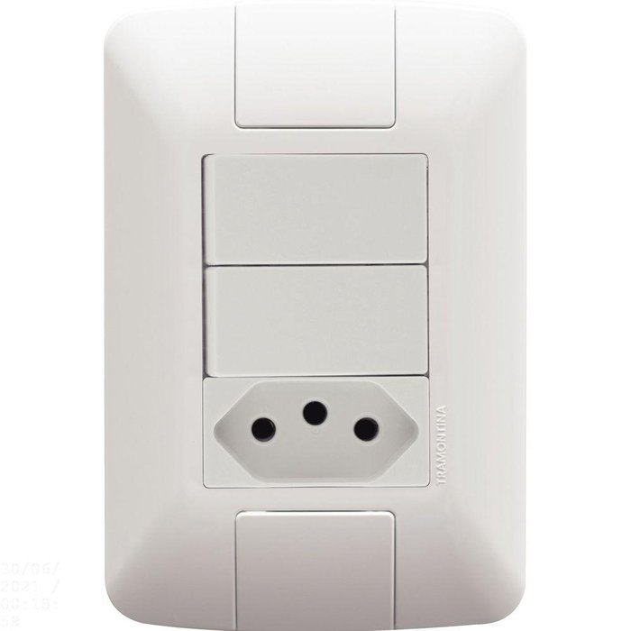 Utilize o Conjunto 4x2 com 2 Interruptores Simples 6 A 250 V e 1 Tomada 2P+T 10 A 250 V Tramontina Aria Branco e tenha um item completo para ligar equipamentos elétricos e eletrônicos e ainda acender as luzes do ambiente. Produzido em termoplástico com acabamento brilho na cor branca, ele possui sistema modular com o suporte incorporado e furo oblongo que facilita a fixação e a regulagem da placa à parede, deixando-a reta; além disso, sua instalação não fica aparente, o que deixa seu cômodo ainda mais bonito. Um item ideal para sua casa, que acompanha suporte e parafusos para a instalação!Orientações.Características GeraisEAN137891435938159DUN1417891435938156NCM8536.69.10Peso Líquido0,0650 kg.Peso Bruto0,0685 kg.Metragem0,000608 m³.Dimensões Embalagem (Compr. X Larg. X Alt.)190x 80x 40 mm.Dimensões Produto (Compr. X Larg. X Alt.)120x 80x 35 mm.Cor 1FFFFFFF HexaObservaçõesA instalação e segurança: É importante que o produto seja instalado por profissional habilitado. Antes de instalar, desligue a energia elétrica.