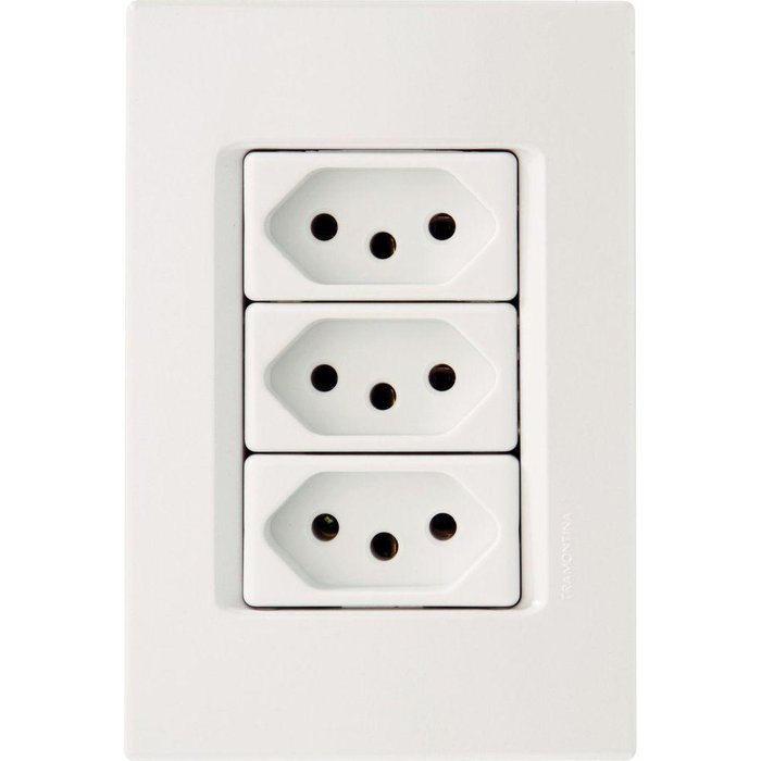 Tenha mais facilidade na hora de ligar eletrônicos e eletrodomésticos com o Conjunto 4x2 com 3 Tomadas 2P+T 10 A 250 V Tramontina IzyFlat Branco. Produzido em termoplástico branco, ele vai garantir maior praticidade e proporcionar um acabamento perfeito entre a placa e a parede, sem deixar frestas e vincos na instalação. Além disso, possui furo oblongo que facilita a fixação e a regulagem da placa à parede evitando que ela fique desalinhada. Sua fixação não é aparente e pode ser utilizada tanto em paredes de alvenaria, quanto em paredes de madeira. Sua placa ainda pode ser trocada por outras cores da linha, garantindo maior versatilidade e estilo. Com a Tramontina, você tem o melhor para sua casa!Orientações.ObservaçõesA instalação e segurança: É importante que o produto seja instalado por profissional habilitado. Antes de instalar, desligue a energia elétrica.Características GeraisEAN137891435047646DUN1417891435047643NCM8536.69.10Peso Líquido0,1040 kg.Peso Bruto0,1120 kg.Metragem0,000600 m³.Dimensões Embalagem (Compr. X Larg. X Alt.)150x 100x 40 mm.Dimensões Produto (Compr. X Larg. X Alt.)122x 83x 35 mm.Cor 1FFFFFF Hexa