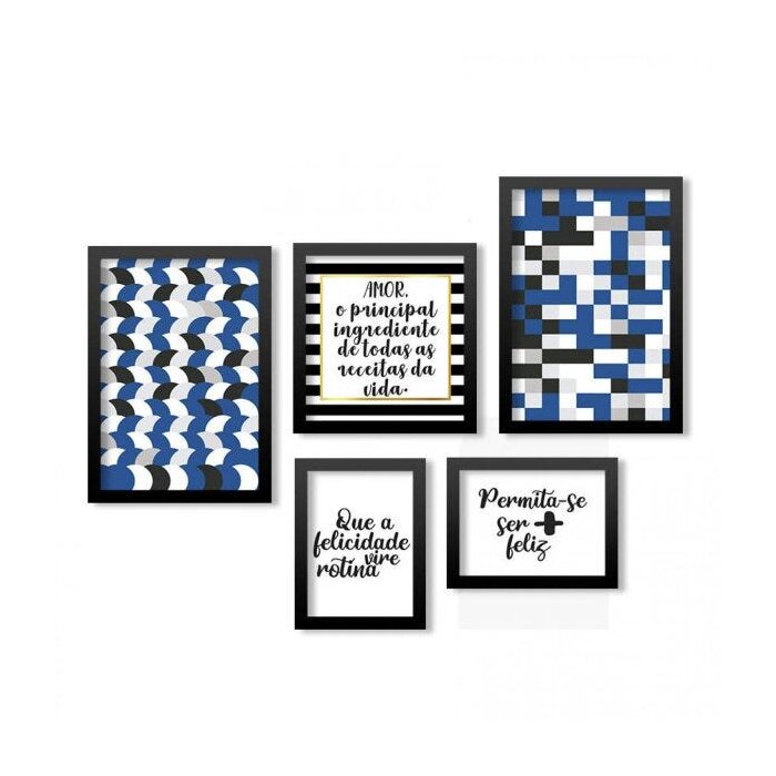 Conjunto 5 Quadros Decorativos Abstrato Azul e Frases Los Quadros
