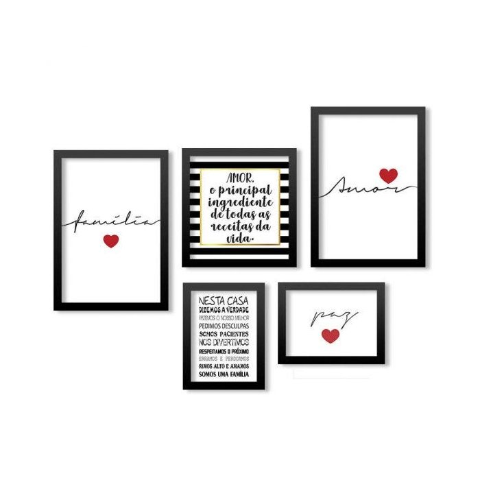 Conjunto 5 Quadros Decorativos Frases Amor Família e Paz Los Quadros