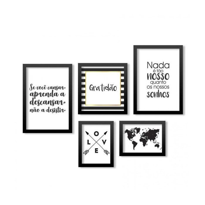Conjunto 5 Quadros Decorativos Frases Love e Mapa Los Quadros