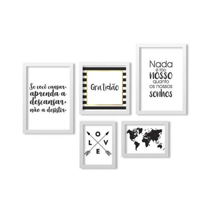 Conjunto 5 Quadros Decorativos Frases Love e Mapa Los Quadros