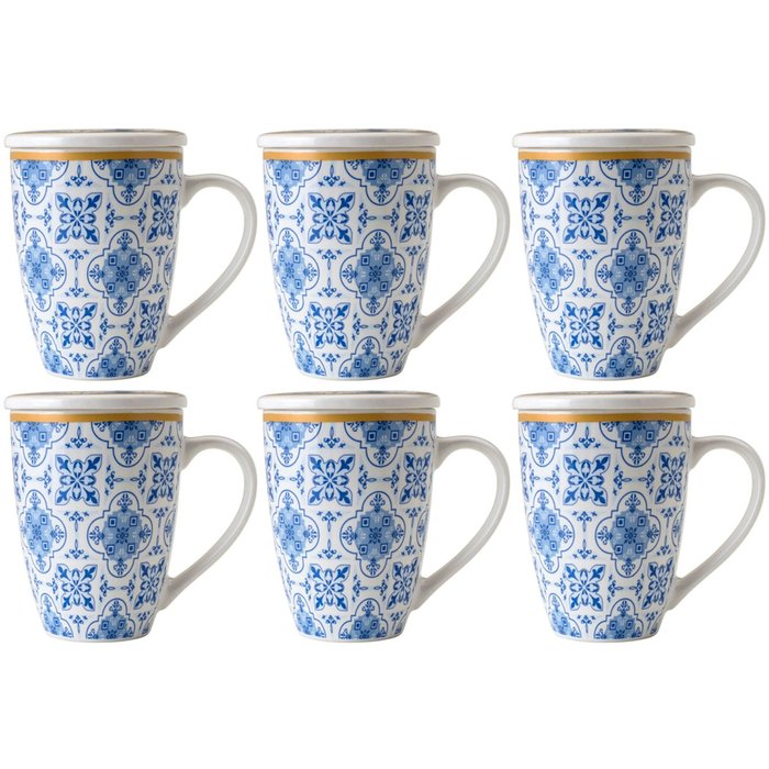 Conjunto 6 Canecas de Porcelana para Chá 310ml com Tampa e Filtro Inox Lisboa Lyor Azul.