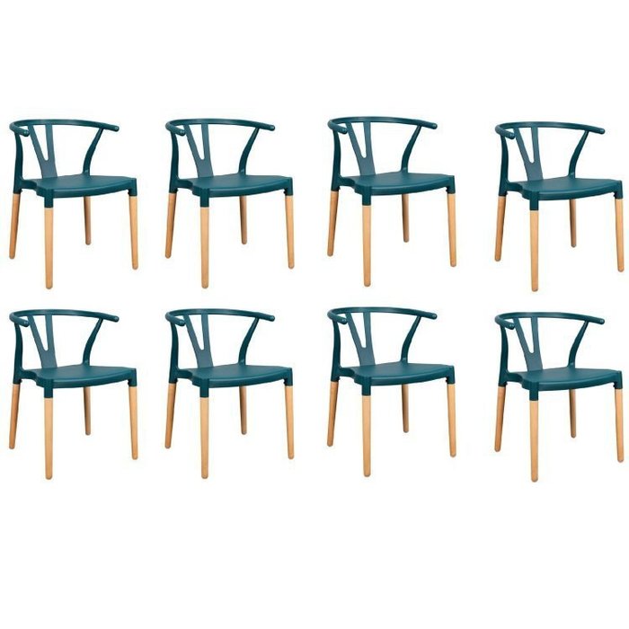 Conjunto com 8 Cadeiras com assento em polipropileno e pernas em madeira.