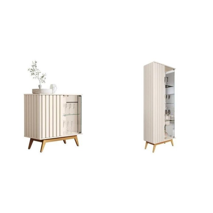 Conjunto de uma Cristaleira com Lateral e Porta Ripada Jb Açaí, Vidro Temp 4mm e Pés e Travessas em Madeira Maciça Perola um Buffet Ripado Açaí de 2 Portas, Vidro Temp 4mm e Pés em Madeira Maciça Perola