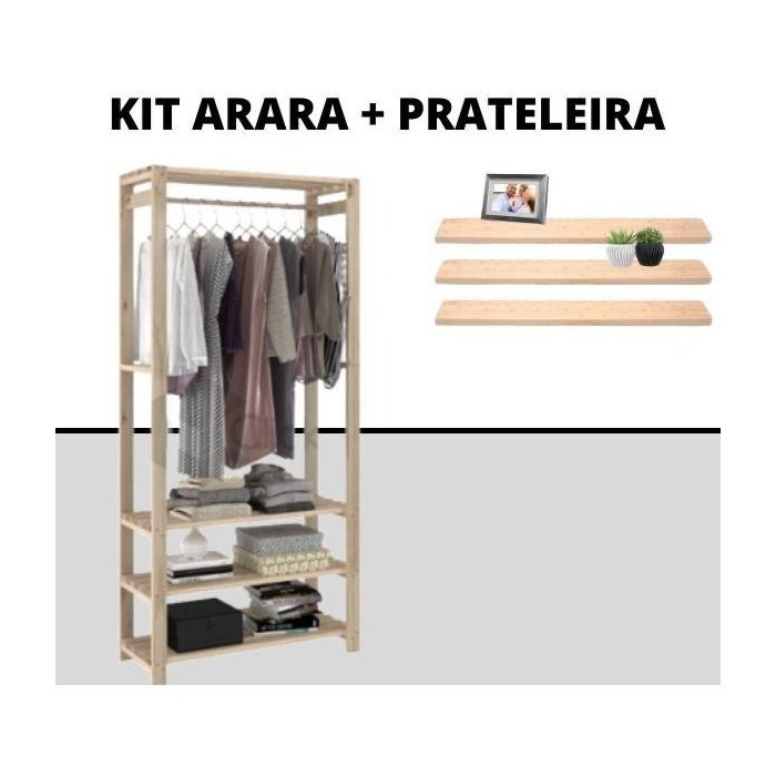 - Estante arara com prateleiras e estrutura em madeira maciça de Pinus