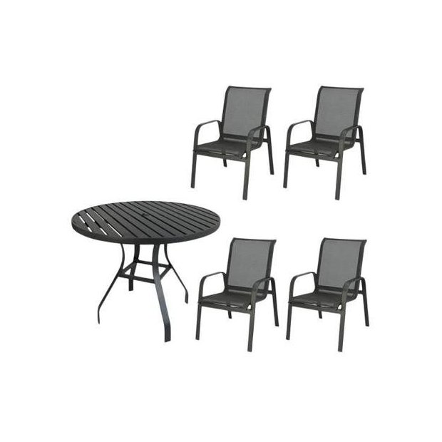 Esse conjunto é composto por uma mesa de 0,90 x 0,75 metros com estrutura em alumínio com pintura eletrostática, o que garante sua durabilidade e resistência à corrosão. O tampo ripado confere um visual moderno e sofisticado ao móvel, além de ser funcional e permitir a circulação de ar, evitando acúmulo de poeira e umidade. As quatro cadeiras também possuem estrutura em alumínio com pintura eletrostática e acabamento em tela sling, proporcionando conforto e elegância ao conjunto. Com seu design elegante e compacto, esse conjunto é perfeito para decorar e equipar áreas externas, como varandas e jardins, com praticidade e estilo. Além disso, as cadeiras são fáceis de limpar e manter, o que as tornam uma opção prática para o dia a dia. Combinando funcionalidade e elegância, esse conjunto é ideal para quem busca um móvel de qualidade para aproveitar momentos de lazer e descontração com conforto e estilo.