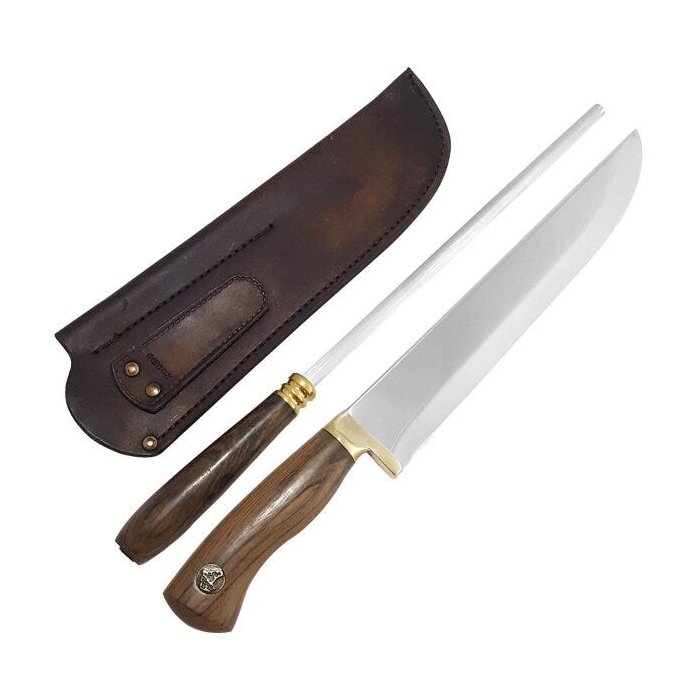 Conjunto modelo churrasco cabo padronizado, produzido em 9 polegadas aço inox tendo a espessura de 3 mm. Acompanha faca, chaira e bainha em couro.