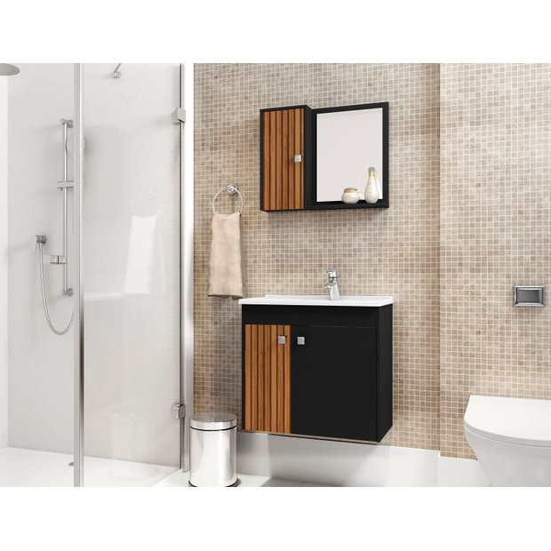 Conjunto Banheiro Munique Bechara Kit Gabinete com 2 Portas e Cuba e Armário com Espelho Ptf/rip Preto Fosco c/ Ripado