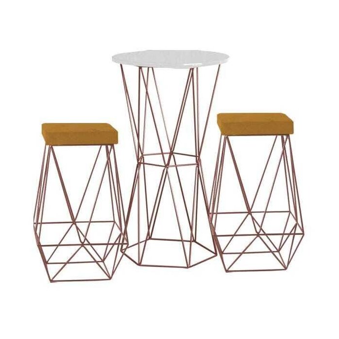 Conjunto Bistrô Rizzo Branco e 2 Banquetas Kathy Suede Mostarda com Bases Bronze - Gran Belo