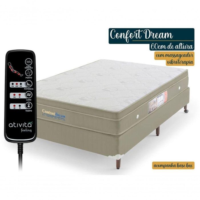 Conjunto Box Viúva Magnético Com Massageador Confort Dream (colchão 128x198 + Base Box) Cor:bege Está com dificuldades para dormir? Dormir bem é o primeiro passo para você viver melhor!O Seu sono merece o melhor..Durma no melhor colchão magnético do Brasile tenha uma ótima experiência sem se preocupar com nada..o nosso colchão magnético conta com os benefícios das tecnologias da Magnetoterapia, do Infravermelho Longo, das pastilhas de EVI, Automassagem Rabatan, Vibroterapia, além de ter 12 anos de garantia..Empresa com registro no INMETRO.Colchões Magnéticos com laudo de pastilhas aprovado e espuma selada. Usamos tecnologia de ponta e por isso, nossos produtos se destacam nos quesitos qualidade, acabamento e beleza no segmento em todo o Brasil.Excelência em atendimento e produto com 100% de aprovação.Empresa 100% Responsável, com o menor indice de reclamações entre as empresas do Segmento, pois prezamos pela satisfação dos nossos clientes..LINHA: Confort DreamTAMANHOS E DIMENSÕES DO COLCHÃO: Viúva (L) 128cm x (C) 188cm x (A) 025cm