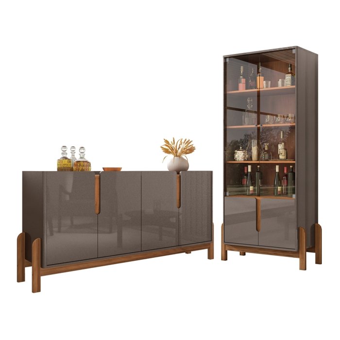 Conjunto Buffet e Cristaleira Jayce Cinza e Cedro