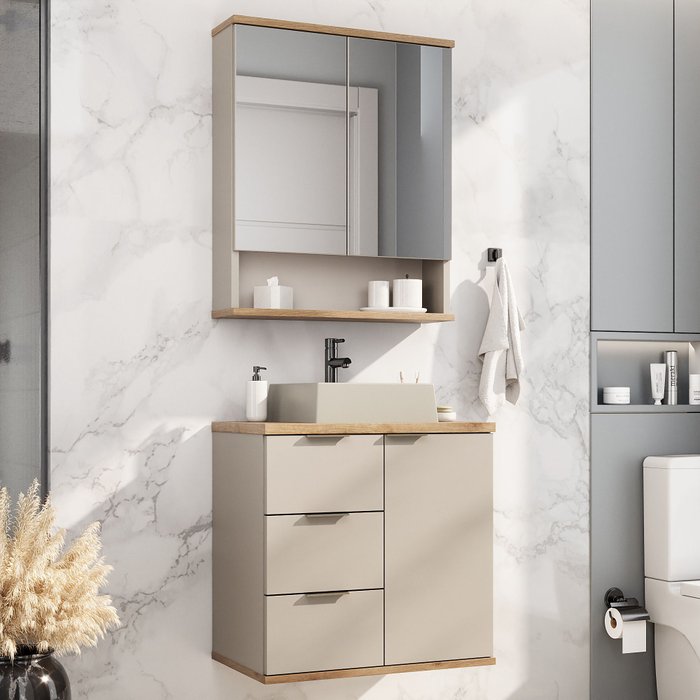Funcionalidade e estilo em um só conjunto. A espelheira com superfície espelhada amplia o ambiente e reflete mais luz, garantindo uma sensação de amplitude e luminosidade ao banheiro. Já o gabinete oferece praticidade e organização, otimizando o espaço e mantendo tudo sempre à mão. Juntos, eles transformam o ambiente com elegância, leveza visual e praticidade no dia a dia.