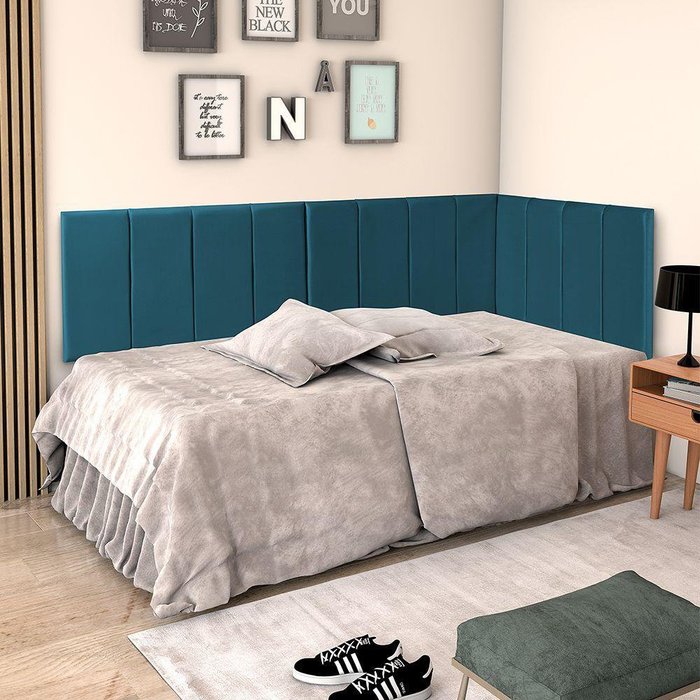 A Cabeceira painel estofada com lateral, é o complemento perfeito para adicionar um toque distinto e único na decoração do seu quarto, aliando em uma só peça conforto e beleza. Ela atende e harmoniza qualquer ambiente.CARACTERISTICAS:Tipo: CabeceiraModelo: Painel estofado com lateralTecido: VeludoCor: AzulDIMENSÕES DO PRODUTO:Altura: 55cmLargura Cabeceira: 90cmLargura lateral: 188cmComprimento: 3,5cmINFORMAÇÕES ADICIONAIS:Produto de fixação na parede. Acompanha kit e manual de montagem.ATENÇÃOAS IMAGENS SÃO MERAMENTE ILUSTRATIVAS E PODEM SOFRER VARIAÇÕES DE COR E PEQUENOS DETALHES DE ACORDO COM O SEU MONITOR, ILUMINAÇÃO DO AMBIENTE E ATÉ MESMO A SUA PERCEPÇÃO VISUAL.Conjunto Cabeceira Painel Estofada com Lateral para Cama de Solteiro Veludo Azul 0,90 X 1,88