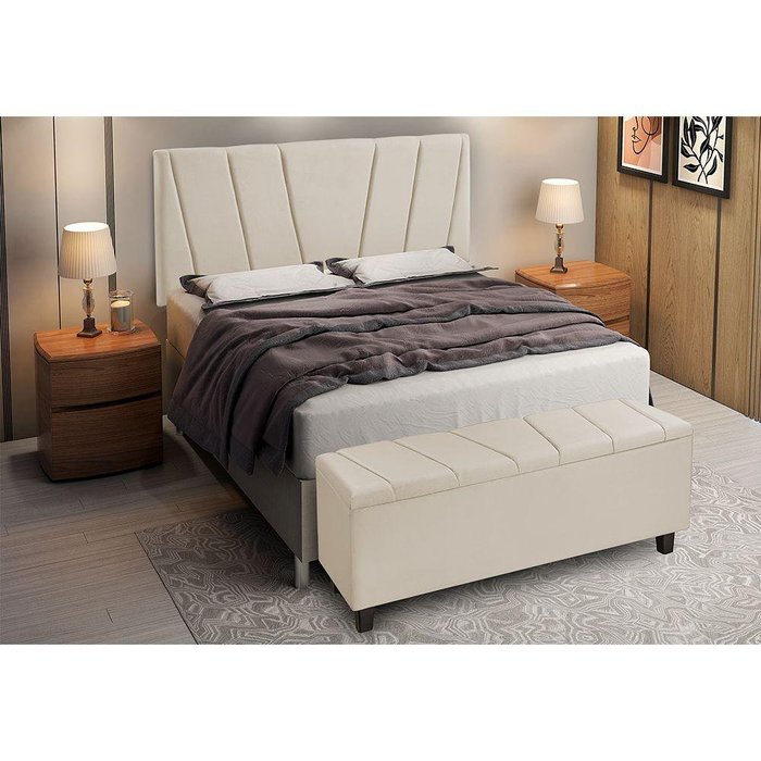 Conjunto Cabeceira Queen E Recamier Baú Estofado Veludo Bege Luxo 1,50M