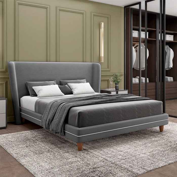 Conjunto Cama com Cabeceira Queen Torres Pés em Madeira Veludo Cinza G91 - Gran Belo