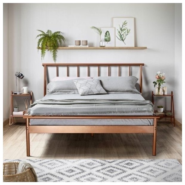 Nada como uma boa noite de sono para melhorar a vida de qualquer um, não é mesmo? Após um dia bem longo, é tão bom deitar na nossa cama! Por isso é tão essencial investir no nosso quarto, deixa-lo um pouquinho mais relax, confortável, aconchegante. A Cama Begônia é um modelo estruturado em aço, estrado em madeira pinus e pintura em cobre. Suas medidas são: 100cm Altura x 178cm Largura x 205,8cm Profundidade. A Mesa de Cabeceira Begônia também tem estrutura em aço e acabamento em pintura, sua altura é de 54cm, largura 33,8cm e profundidade 30cm. Pode ser utilizada apoiada no chão ou suspensa na parede.
