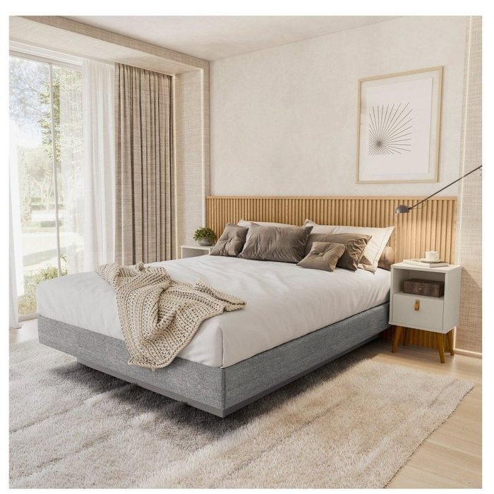 Conjunto Cama Queen Bristol, Cabeceira e 2 Mesas de Cabeceira Buzios Carvalho/Cinza