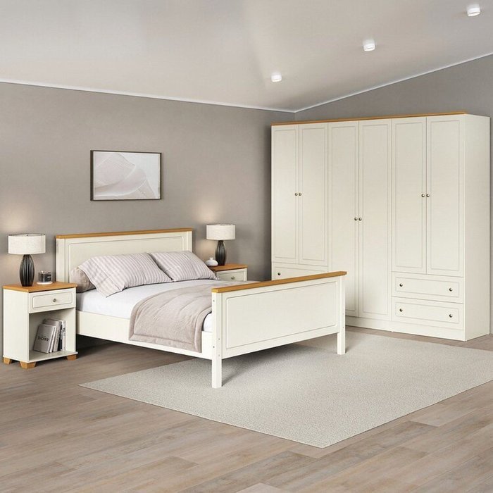 Conjunto Cama Queen Guarda-Roupa 6 Portas 2 Mesas de Cabeceira Ananda CabeCasa MadeiraOriginals Off White/Mel