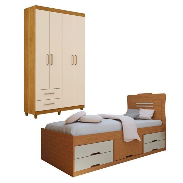 Conjunto Cama Solteiro 5 Gavetas Júlia e Guarda-roupa Solteiro 4 Portas 2 Gavetas Canadá Plus Cinamomo/Off White