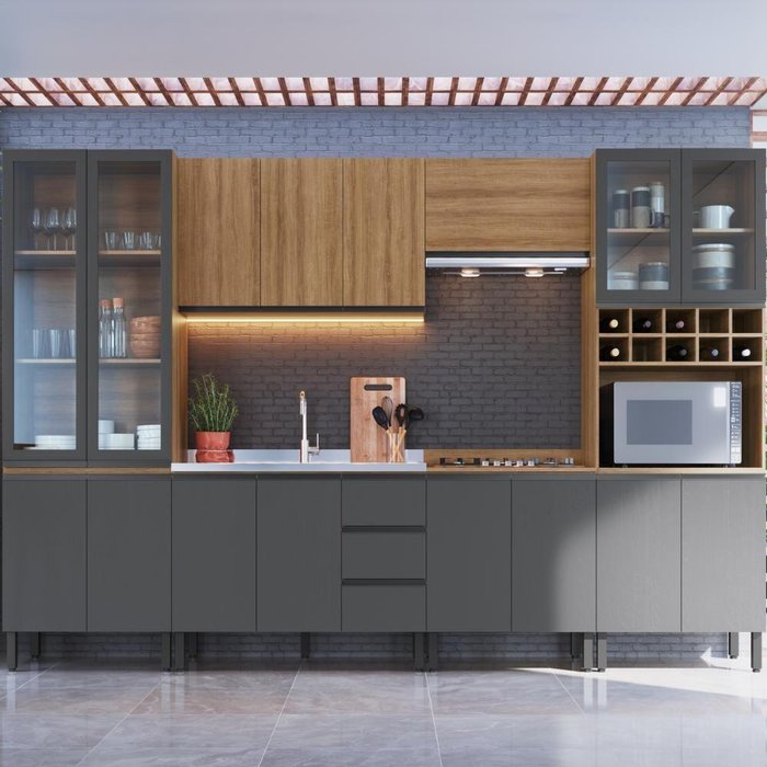As novas cozinhas Quiditá possuem design contemporâneo. São elaboradas a partir dos projetos da nossa marca de cozinhas planejadas, Almadra. Neste formato oferecemos os módulos permitindo composições variadas para as suas necessidades. Armários com muitas facilidades, que podem ser montados do lado direito ou lado esquerdo. Proporcionando praticidade e funcionalidade, feita com materiais de primeira linha, ferragens e acessórios de última geração. Projeto pensado para lhe oferecer praticidade e bem estar no seu dia a dia.Conjunto Cambará Montana/Grafite