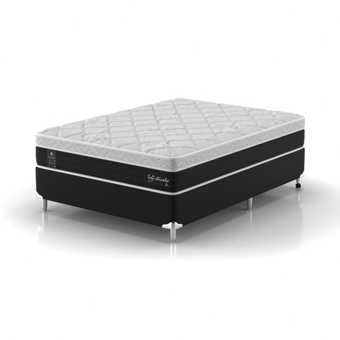 Colchão com Estrutura interna composta de molas ensacadas invidualmente, Espuma visco elástica, espuma puliuretano densidade 26kg/m3, EPS - Poliestireno Expandido e feltro resinado. Faixa lateral no tecido maquinetado geométrico, tampo e europillow na malha 180g e fundo do produto TNT 100g anti derrapante. Cor da faixa grafite, tampo e europillow branco com estampa cinza, fundo preto. Box com madeira pinus e eucalipito, Faixa lateral no tecido maquinetado geométrico grafite, TNT 70g preto na parte de cima e na parte de baixo.