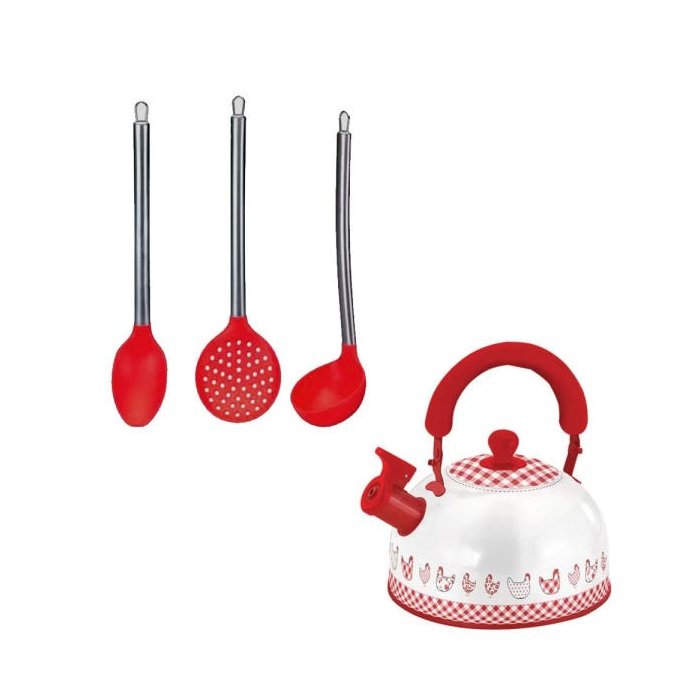 Conjunto Chaleira em Aço Inox Carijó Vermelho 2L e Utensílios de Cozinha