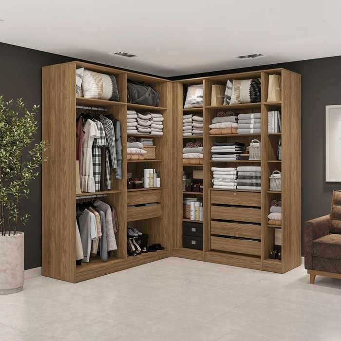 Para quem sempre quis o quarto dos sonhos, a Linha Closets do Modulado Adapt da Kappesberg é a escolha certa. Com cinco peças, o combo CB1146 é produzido em MDP de 15mm, o que proporciona mais robustez, firmeza e qualidade, sendo ideal para quem ama espaços abertos e funcionais sem abrir mão da organização. Espaçoso e muito versátil, o combo é indispensável em todas as composições, principalmente nas de canto, aproveitando cada espaço, e com medida de 2,30m de altura, as divisões internas dos módulos contam com nichos de tamanhos diferentes, ideais para calçados e roupas dobradas, já os cabideiros, metálicos e de suporte interno, são perfeitos para organizar peças maiores, como casacos e vestidos sem amassar. E nas gavetas, com corrediças telescópicas, você otimiza espaço e organiza acessórios e peças menores. Suas sete camadas de pintura na cor nogueira, tanto na parte interna quanto na externa, possuem acabamento touch, com a textura dos veios da madeira, e além de combinar com todos os ambientes, garante a sensação de conforto e aconchego ao espaço, remetendo aos tons da natureza e deixando seu quarto perfeito. O diferencial fica por conta da sua montagem interna ajustável, podendo ampliar a quantidade de gavetas e prateleiras, deixando-o do seu jeito. E aqui, o combo acompanha um kit com duas gavetas para instalar nos módulos, garantindo ainda mais espaço e organização para o seu quarto. Renove seu quarto com toda a qualidade e beleza que a Linha Closets do Modulado Adapt da Kappesberg oferece e aproveite cada momento. Informações importantes: As imagens são meramente ilustrativas, não acompanha acessórios; Pode haver variação de cor de acordo com a calibragem da tela onde o produto está sendo visualizado; Todos nossos móveis são entregues desmontados; A montagem é sempre por conta do cliente (orientamos a contratação de um profissional qualificado, o manual de montagem acompanha o produto); O vídeo do produto pode ser genérico, então atente-se às imagens do anúncio para optar pela cor/modelo. Compõe o conjunto 5 peças: 1x Guarda-Roupa Sem Portas Closet 2 Gavetas Kappesberg Adapt Nogueira 158cm; 1x Guarda-Roupa de Canto Reto Sem Portas Closet Kappesberg Adapt Nogueira 100cm; 1x Guarda-Roupa Sem Portas Closet 2 Gavetas Kappesberg Adapt Nogueira 80cm; 1x Kit 2 Gavetas Kappesberg Adapt Nogueira 77cm; 1x Guarda-Roupa Sem Portas Closet Kappesberg Adapt Nogueira 25cm; *Obs.: Não acompanha cama, colchão, acessórios, decorações e periféricos; Largura A: 222cm / B:205cm.