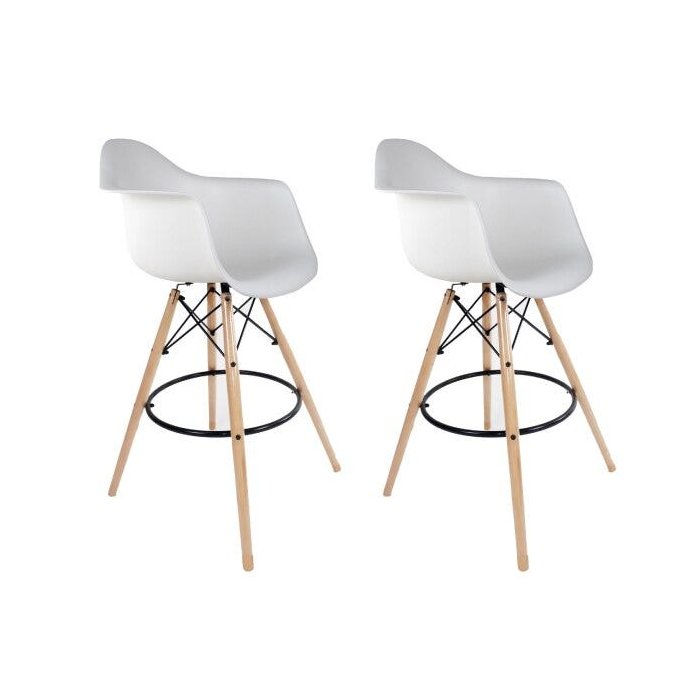 Conjunto com 2 Banquetas Eames com Braços Branca - Base de Madeira Natural